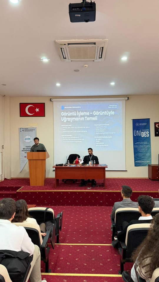 Within the scope of UNIDES 5th Term, a conference themed on computer vision, artificial intelligence and embedded systems in the defence industry was organised by TOGÜ Computer Engineering Club. Valuable speakers Barış Mert Kadıoğlu and Ahmet Şentosun from BMS Defence Technologies Inc. shared their valuable knowledge and experience with our young people.